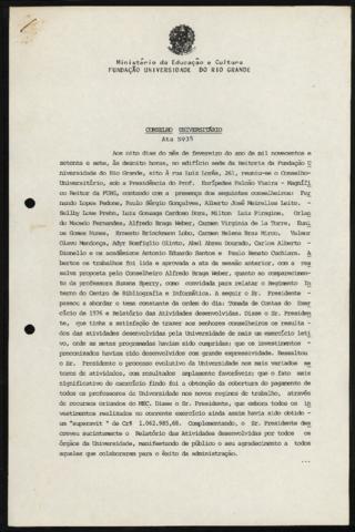 - Tomada de Contas do Exercício de 1976 e Relatório das atividades desenvolvidas. O Prof. Eurípedes Falcão Vieira explicou as atividades desenvolvidas pela Universidade e ressaltou o processo evolutivo da instituição, com o pagamento de todos os professores, com recursos do MEC. Mencionou que com todos os recursos investidos ainda tinham um superavit de Cr$ 1.062.985,68. Na sequência apresentou o relatório de atividades e agradeceu a participação da administração e ao Diretório Central dos Estudantes. O Prof. Álvaro Ribeiro, Contador da Universidade, detalhou o Balanço Orçamentário de 1976. Aprovados.