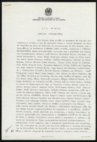 Documento em suporte papel e datilografado. A ata é registrada em uma estrutura sequencial, de acordo com o número da reunião.
