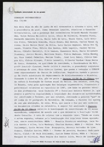 - Parecer nº 03/88 da 3ª Câmara do Conselho Universitário. Assunto: prestação de contas anual do reitor. A Câmara, de posse dos documentos, aprovou os balanços orçamentário, financeiro e patrimonial, relativo ao exercício do ano de 1987. Parecer aprovado.