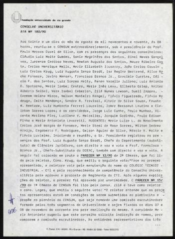 - Parecer nº 15/90 da 1ª Câmara do Conselho Universitário. Assunto: projeto de novos Estatutos para a Fundação Universidade do Rio Grande e Universidade do Rio Grande e Regimento Geral da Universidade do Rio Grande. A Câmara entende que os projetos apresentados estão em condições de serem submetidos ao plebiscito e propôs que seja nomeada uma comissão de escrutinadores formada pelos três segmentos da Universidade (docentes, técnicos e discentes), fixando as datas de realização da consulta. Aprovado.