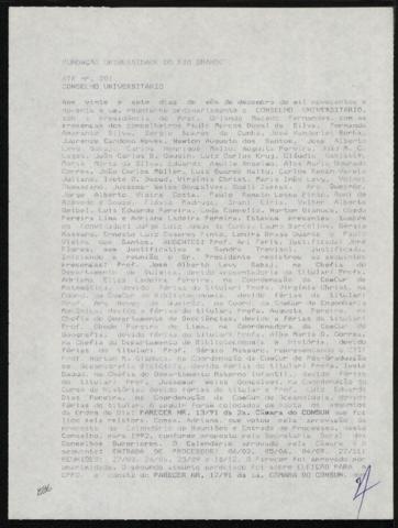 - Parecer nº 17/91 da 1ª Câmara do Conselho Universitário. Assunto: eleição para a Comissão Permanente de Pessoal Docente (CPPD). A Câmara homologou a eleição da Associação dos Professores da Universidade do Rio Grande (APROFURG) para a CPPD; que o Conselho Universitário (CONSUN) eleja seus representantes; que o mandato dos atuais membros pela comunidade e pelo CONSUN, permaneçam até novembro de 1993. Aprovado. Foram eleitos os novos representantes.