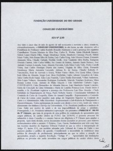 - Parecer nº 06/95 da 3ª Câmara do Conselho Universitário. Assunto: proposta de uma política de contratação de aposentado para cargos públicos efetivos na Universidade do Rio Grande. Dada a complexidade do tema e as divergências de opiniões, os conselheiros aprovaram, na reunião do dia 26/06/95, Ata 238, que a mesma baixasse em diligência para novos estudos. Carlos Alberto Eiras Garcia, relator da Câmara, considerando a necessidade de estabelecer uma política transparente de absorção de profissionais no quadro efetivo da Universidade encaminhou uma proposta de Resolução, que após lida esta foi discutida, retificada e aprovada pelo Conselho.
