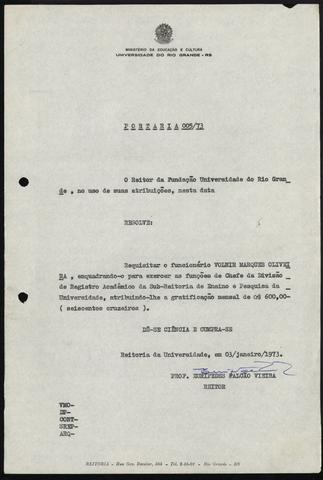 Portaria que designa requisitar o funcionário Volmir Marques Oliveira, enquadrando-o para exercer as funções de chefe da divisão de registro Acadêmico da Sub-Reitoria de ensino e pesquisa da Universidade, atribuindo-lhe a gratificação mensal de 600,00 cruzeiros.