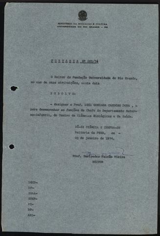 Portaria que designa o professor Luiz Gonzaga Cardoso Dora para desempenhar as funções de Chefe do Departamento Materno-infantil, do Centro de Ciências Biológicas e da Saúde.