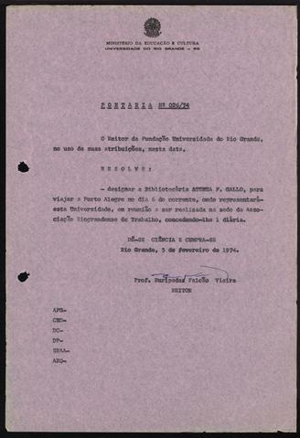 Portaria que designa a Bibliotecária Atenea F. Gallo, para viajar a Porto Alegre no dia 6 do corrente, onde representará esta Universidade em reunião a ser realizada na sede da Associação Riograndense de Trabalho, concedendo-lhe 1 diária.