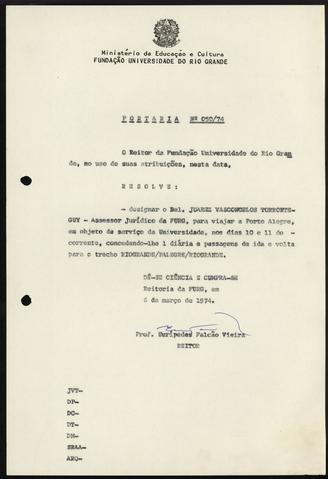 Portaria que designa o Bel. Juarez Vasconcelos Torronteguy - Assessor Jurídico da FURG, para viajar a Porto Alegre a serviço desta Universidade, nos dia 10 e 11 do corrente, concedendo-lhe 1 diária e passagens de ida e volta