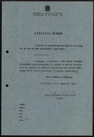 Portaria que designa a servidora Vera Regina Martins de Martins, para desempenhar as funções de Oficial de Gabinete da Reitoria da FURG, atribuindo-lhe uma gratificação mensal de 350,00 cruzeiros