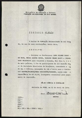 Portaria que designa os professores Irma Hildes Camay de Mate, Neusa Arruda Souza, Yamandu Perez Banfi e Israel Korc Makowicz para viajarem a Caxambu, nos dias 2,3 e 4 de maio próximo, a fim de participarem da III reunião Anual da Sociedade Brasileira de Bioquímica, concedendo a cada um 5 diárias, passagens de ida e volta para o trecho, assim como a importância de 50,00 cruzeiros para pagamento da inscrição.