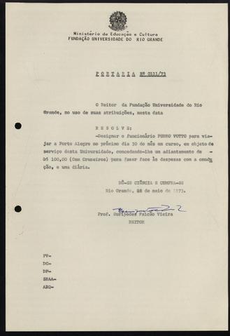 Portaria que designa o funcionário Pedro Votto, Para viajar a Porto Alegre no próximo dia 30 do mês em curso a serviço desta Universidade, concedendo-lhe um adiantamento de 100,00 cruzeiros para despesas de combustível e uma diária.