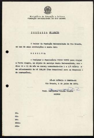 Portaria que designa o funcionário Pedro Votto para viajar a Porto Alegre a serviço desta Universidade,  nos dias 10 e 11 deste mês, concedendo-lhe 1 e ½  diárias e um adiantamento de 100 cruzeiros para despesas de combustível.