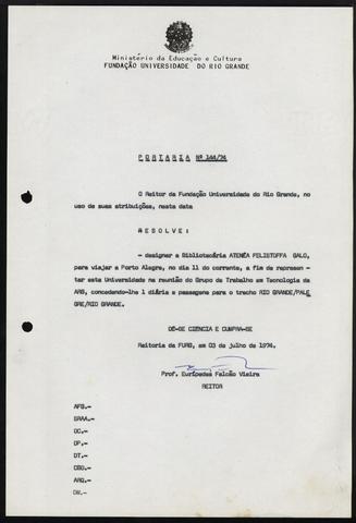 Portaria que designa a Bibliotecária Atenéa Felistoffa Galo para viajar a Porto Alegre no próximo dia 11, a fim de representar a Universidade na reunião de grupo de trabalho e Tecnologia da ARB, concedendo-lhe 1 diária e passagens