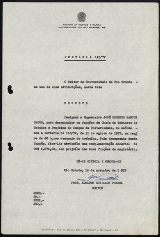 Portaria que designa o Engenheiro José Roberto Mansur Daoud para desempenhar as funções de Chefe do Gabinete de Estudos e Projetos deste Campus de acordo com a Portaria n° 110/72 de 31 de agosto em regime de 40 horas semanais, pelo desempenho desta função, fica-lhe atribuído uma complementação salarial de 1.274,00 sem prejuízos das suas funções de magistério.