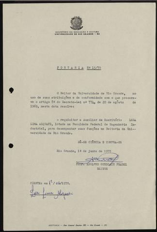Portaria que designa, requisitar a auxiliar de escritório Leda Lima Alquati, lotada na Faculdade Federal de Engenharia Industrial, para desempenhar suas funções na Reitoria da Universidade de Rio Grande.