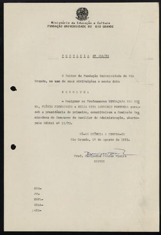 Portaria que designa, sob a presidência do primeiro,os professores Ubyrajara Vaz Senna e Nilza Rita Lourenço Fontoura para constituírem a comissão examinadora do concurso de auxiliar de administração aberto pelo edital n° 11/73.