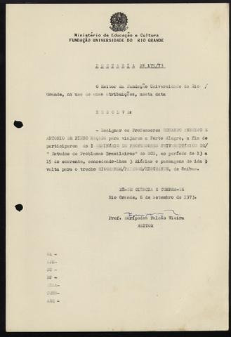Portaria que designa os professores Eduardo Anselmo e Antonio de Pinho Maçada, para viajar a Porto Alegre a fim de participarem do 1° Seminário de professores universitários de “Estudos de Problemas Brasileiros”do RGS, no período de 13 a 15 do corrente, concedendo-lhes 3 diárias e passagens de ida e volta de ônibus.