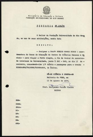 Portaria que designa a professora Eunice Gomes Nunes, coordenadora do Curso de Educação do Centro de Ciências Humanas e Sociais, para viajar a Porto Alegre, a fim de tratar de assuntos de interesse da Universidade, junto à SEC-DAU, no dia 17 do corrente concedendo-lhe ½ diária e passagens de ônibus.