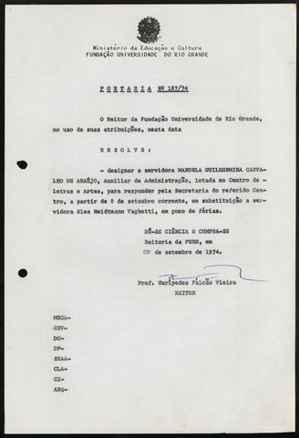 Portaria que designa a servidora Manoela Guilhermina Carvalho de Araujo, Auuxiliar de Administração, lotada no Centro de Letras e Artes, para responder pela Secretaria do referido Centro, a partir de 2 de setembro corrente, em substituição a servidora Elsa Heidtmann Vaghetti, em gozo de férias.