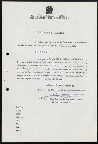 Portaria que designa o professor Melik Emilio Castanheira Curi, para substituir o professor Ary Luiz Neves de Queiroz na comissão para julgamento das propostas de aquisição de uma lancha laboratório, destinada aos trabalhos de pesquisa do Centro de Ciências do Mar, conforme Portaria n° 182/74 de 26 de agosto pp., tendo em vista a participação deste último, no Congresso Nacional de Engenharia Naval no Rio de Janeiro.