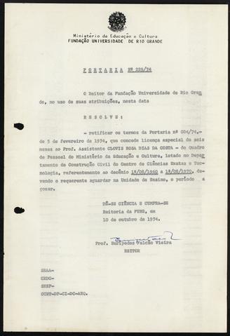 Portaria que retifica os termos da Portaria n° 024/74 do dia 5 de fevereiro, que concede licença especial de seis meses ao professor assistente Clóvis Rosa Dias da Costa, do quadro de pessoal do Ministério da Educação e Cultura lotado no Departamento de Construção Civil do Centro de Ciências Exatas e Tecnologia, referente ao decênio 1°/08/1960 a 1°/08/1970 devendo a requerente aguardar na Unidade de Ensino o período gozar.