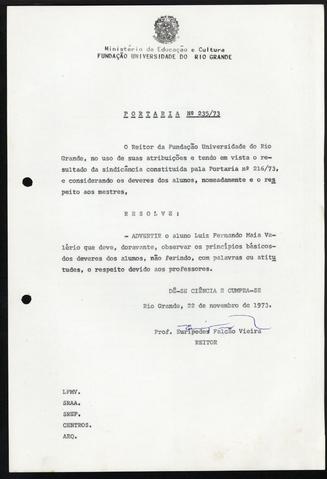 Portaria que Adverte o aluno Luiz Fernando Maia Valério que deve, doravante, observar os princípios básicos dos deveres dos alunos, não ferindo com palavras, ou atitudes, o respeito devido aos professores.