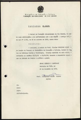 Portaria que concede, a pedido do professor titular Graciano Souza do quadro de pessoal do Ministério da Educação e Cultura, lotado no Centro de Ciências Exatas e Tecnologia, licença especial de 6 meses referente ao decênio 01/03/58 a 01/03/68 devendo o requerente aguardar na Universidade de Ensino o período a gozar.