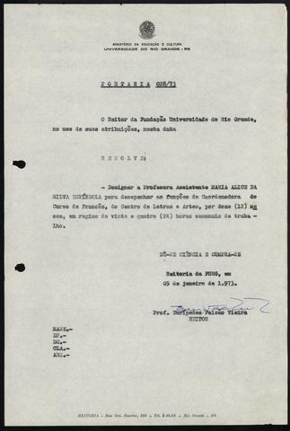 Portaria que designa a professora assistente Maria Alice da Silva Espíndola, para desempenhar as funções de coordenadora do Departamento de Geociências do Centro de Ciências Exatas e Tecnologia, por 12 meses em regime de 24 horas semanais.