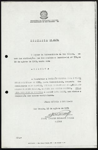 Portaria que constitui a Comissão Central para o Vestibular unificado de 1972, desta Universidade composta pelos professores Aldo Lapolli, Klinger de Carvalho Rios, Gilberto Barros Cardoso, Iracema dos Santos Martins, Nilza Rita Fontoura e Sellby Love Prehn, com vista a realização dos exames vestibulares.