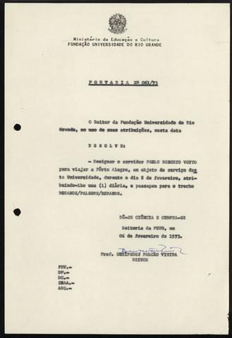 Portaria que designa o servidor Paulo Roberto Votto, para viajar a Porto Alegre, a serviço da Universidade, durante o dia 8 de fevereiro atribuindo-lhe uma diária e passagem.